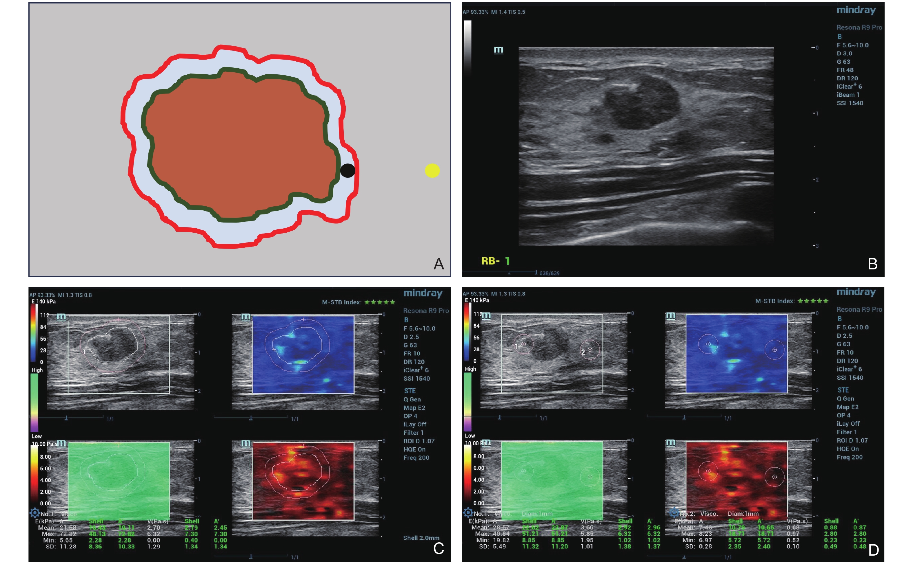Schematic diagram of ROIs. (A) The gray box is the value box, the orange part is the lesion, the green line is the manually drawn tumor outline, which is ROI-1. The red line is the border automatically drawn by the shell tool. The black circle is ROI-2. The yellow circle is ROI-3. (B-D) Fibroadenoma of a 29-year-old female in the right breast. The red box is the elasticity value, and the blue box is the viscosity value."