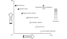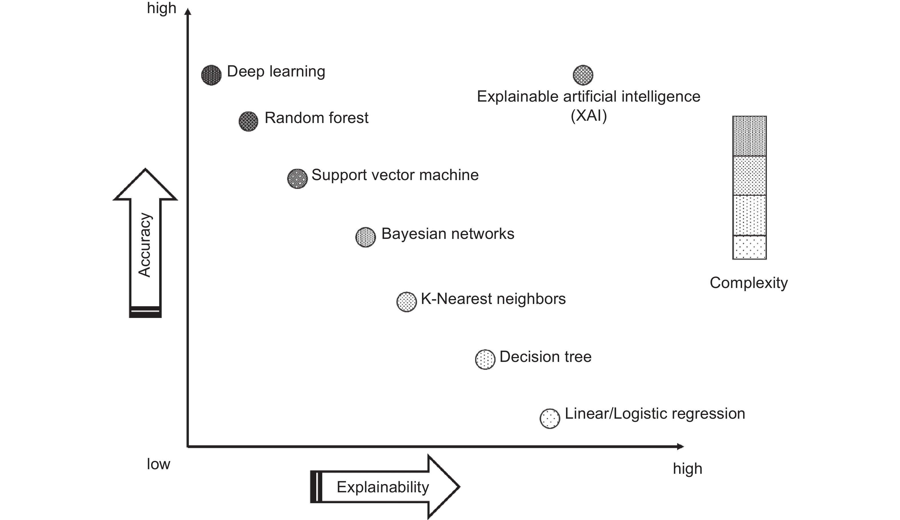 Trade-off between accuracy and explainability. Different machine learning models trade off between accuracy, explainability and complexity. Deep learning and random forests perform better in terms of accuracy, but are less explainable, while decision trees and linear regression models are easier to interpret, but have relatively lower accuracy."
