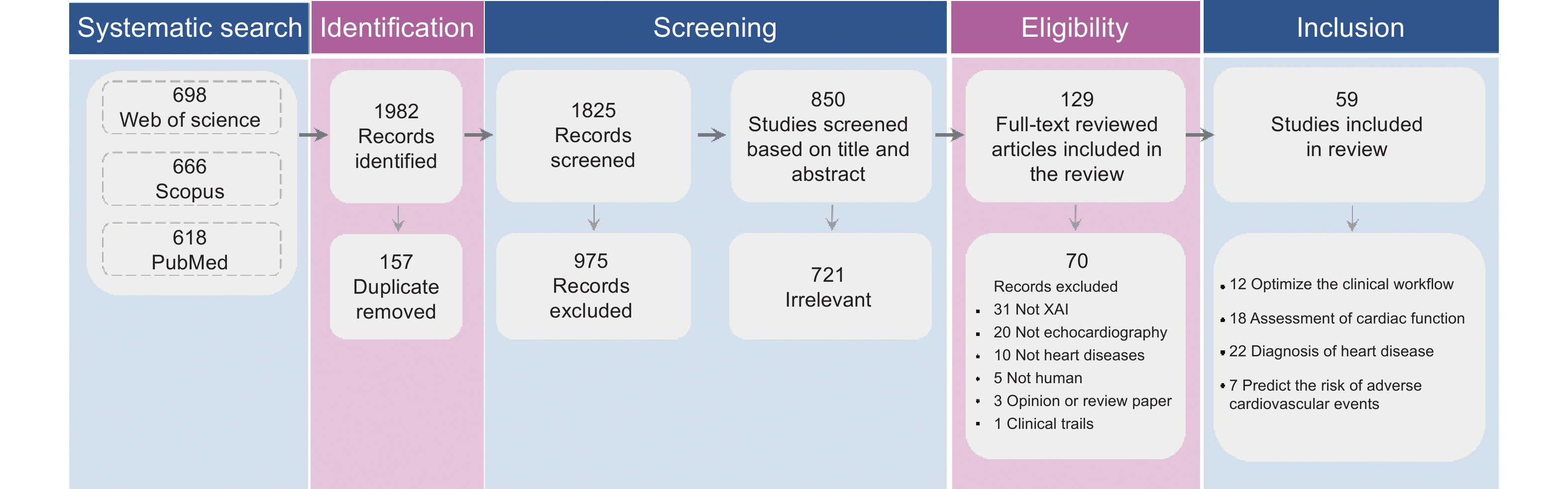| Inclusion | XAI in echocardiography | XAI can be applied to many different applications. Still, the focus of our review is on echocardiography, since this area is one of the most critical applications of AI and XAI. |