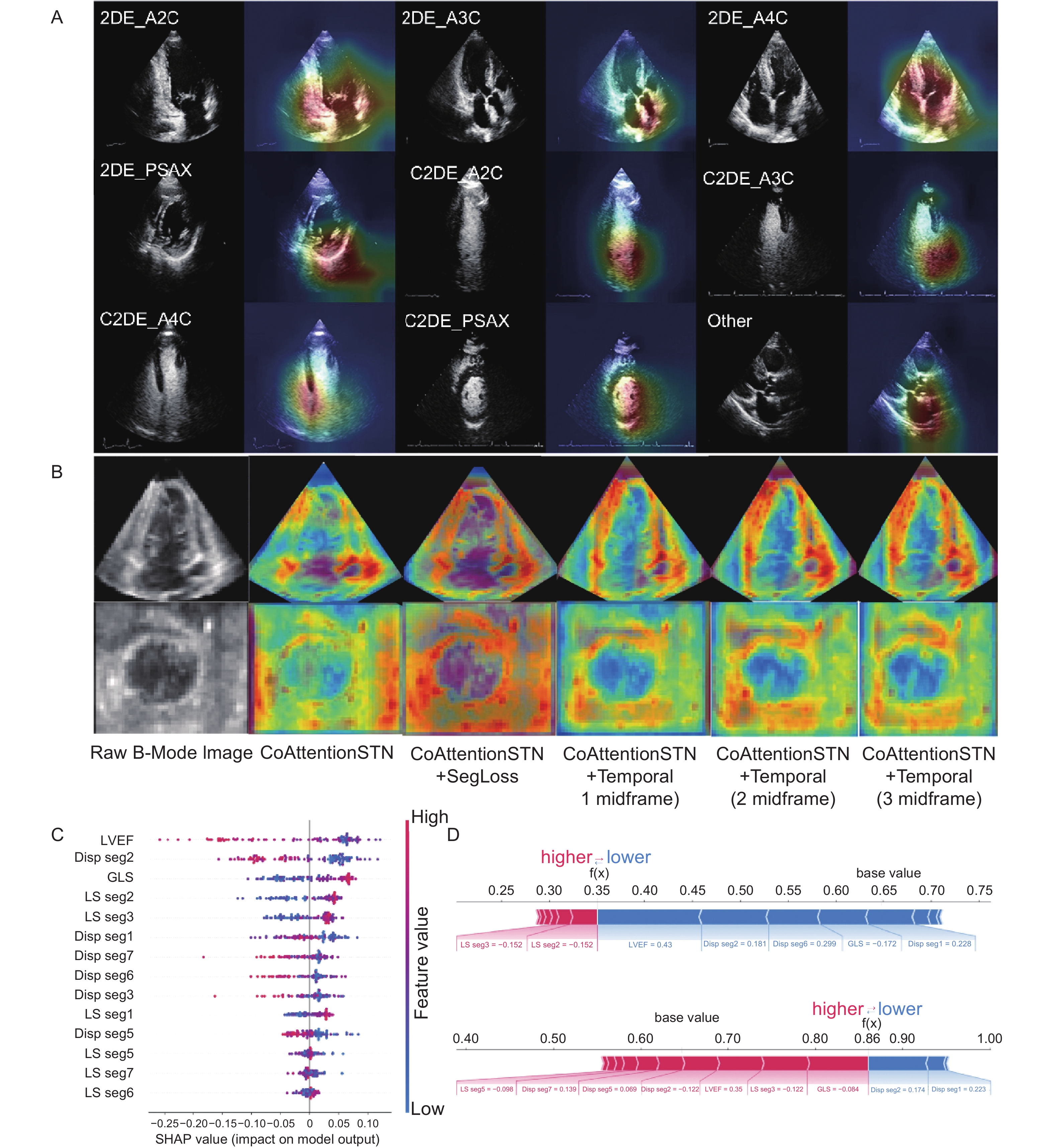 Clinical examples and interpretation. (A) Grad-CAM. Original images and the results of EchoV-Net visualization of the most related regions for view recognition [105]; (B) Attention maps. In porcine echocardiographic simulation data, Co-AttentionSTN enhances the interpretability of motion tracking through multi-frame constraints [66]; (C) SHAP analysis. Positive SHAP values indicate that the feature value contributes to a positive classification (MI), while negative SHAP values denote a contribution to a negative classification (Non-MI) [91]; (D) SHAP analysis. SHAP values show their contributions to classification, and the predicted probability of belonging to the MI class for two misclassified patients in the test set [91]. Reproduced with permission from Elsevier © Elsevier"