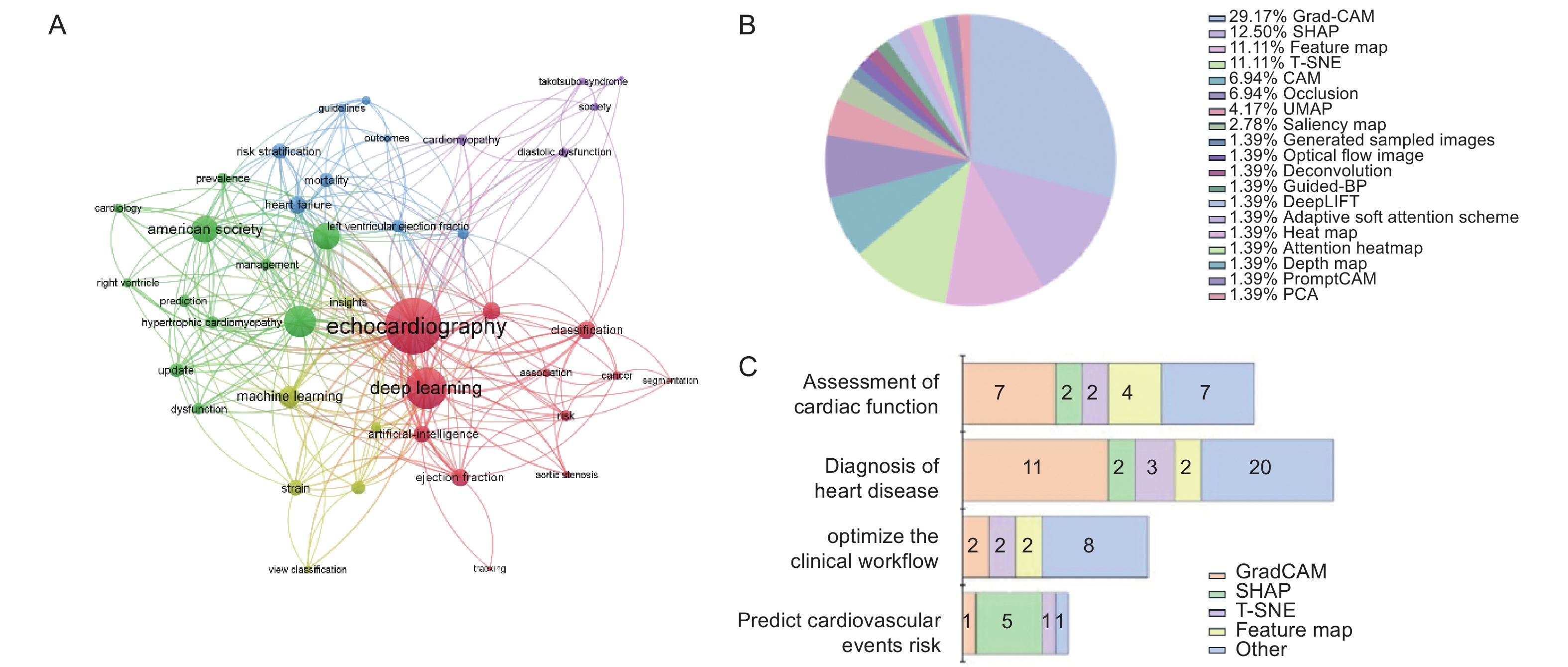 Literature analysis and statistical graphing. (A) Keyword co-occurrence map. The size of the nodes and labels in a cluster is proportional to the frequency of occurrence of the respective keyword. The thickness of the edges denotes the strength of co-occurrence between the connected keywords, while closer nodes represent more relation in context; (B) Pie chart of the share of different XAI techniques in echocardiographic studies. In 59 echocardiography studies utilizing XAI tools, the distribution of various technologies; (C) Bar chart of XAI technologies' distribution in echocardiographic-related scenarios. The distribution of various XAI tools across the four application scenarios of AI-assisted echocardiography images."