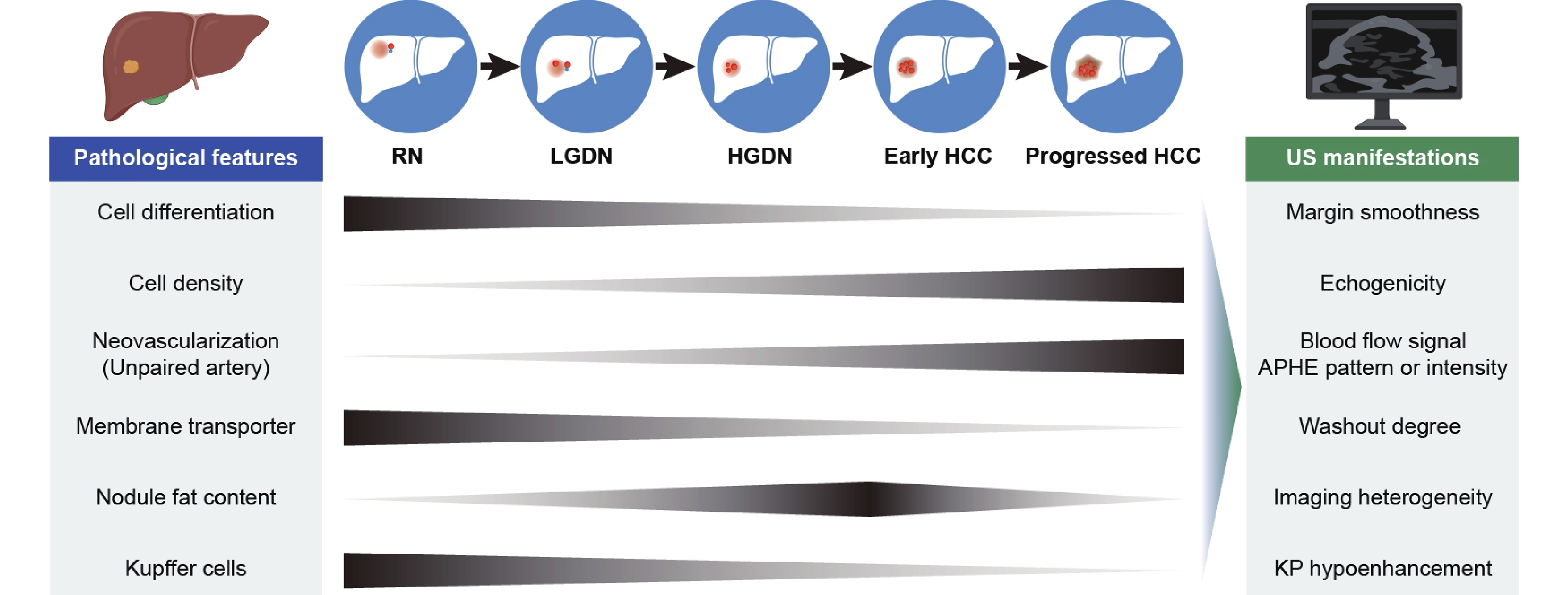 Major pathologic changes of liver nodules during hepatocarcinogenesis and associated ultrasonographic manifestations. RN, regenerative nodule; LGDN, low-grade dysplastic nodule; HGDN, high-grade dysplastic nodule; HCC, hepatocellular carcinoma; US, ultrasound; APHE, arterial phase hyper enhancement; KP, Kupffer phase."