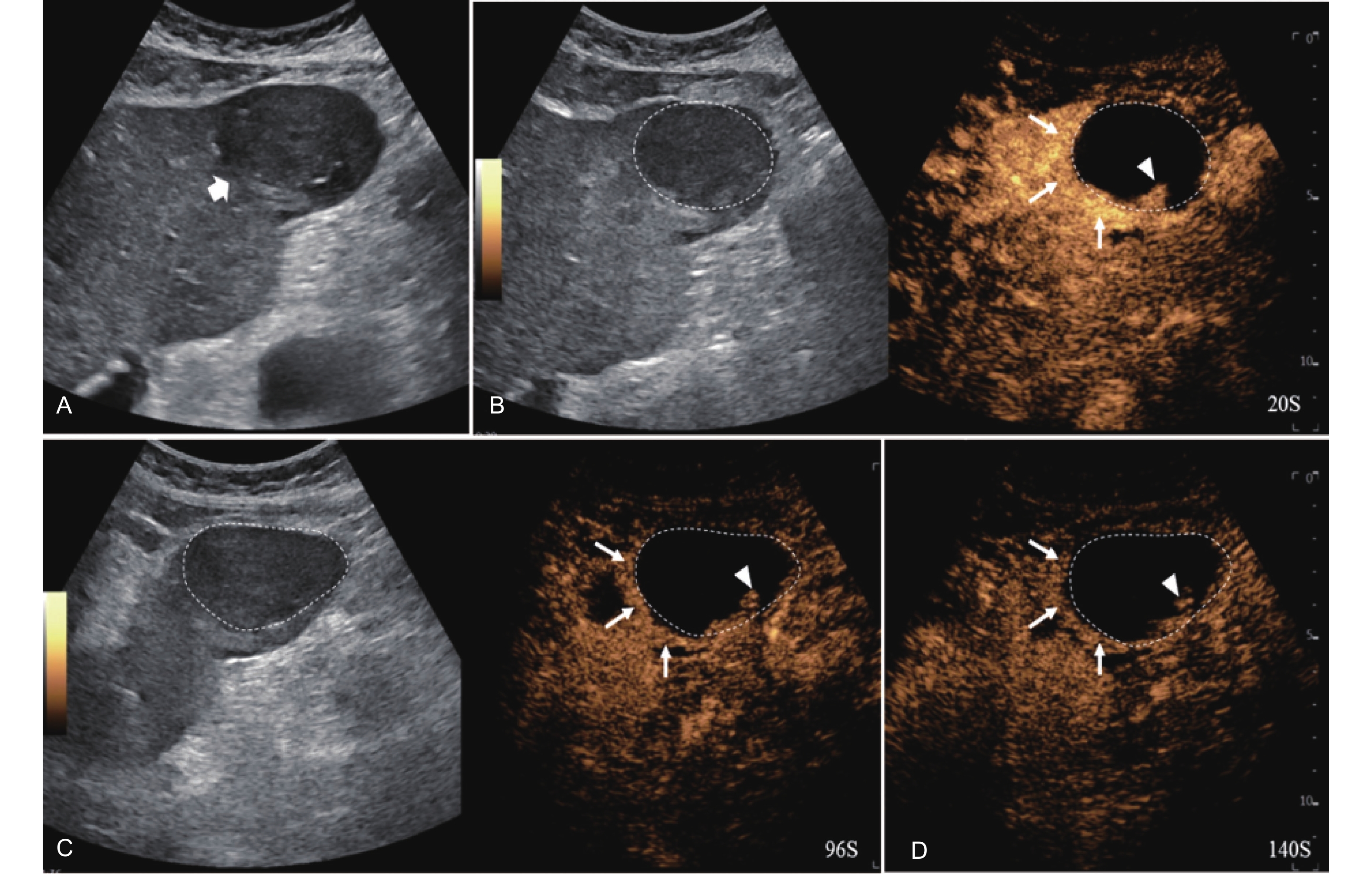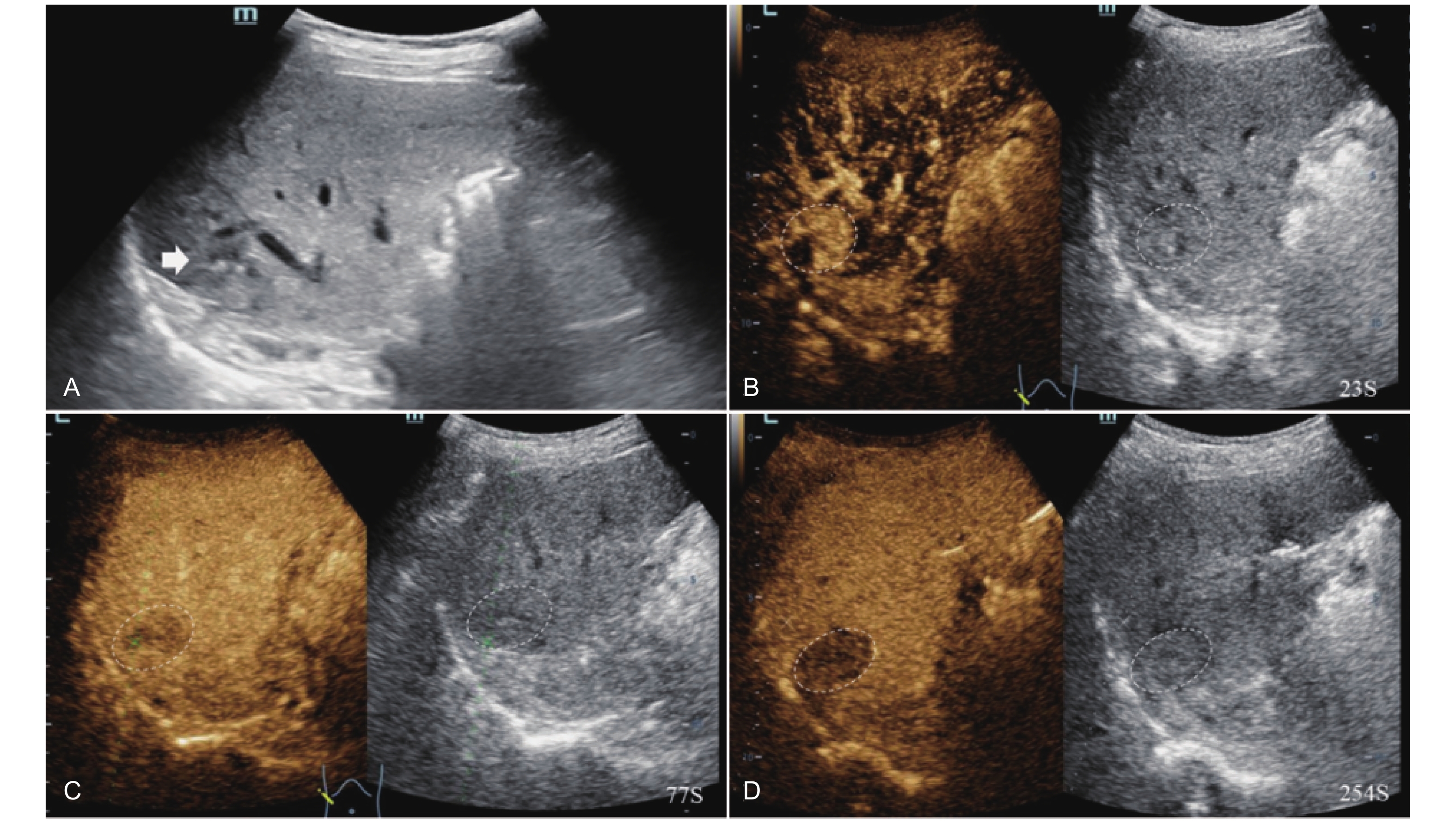 LR-TR Viable. A 56-year-old male with HCC, 1 year after RF ablation. (A) B-mode image shows a heterogeneous mildly hypoechoic lesion (thick arrow) with poor-defined margins in segment VII; (B) Post-treatment CEUS shows intralesional heterogeneous hyperenhancement; (C) The lesion shows mild washout in the portal venous phase; (D) The lesion shows marked washout in the late phase. Perilesional enhancement remains identical to the surrounding liver parenchyma throughout all phases. Findings are consistent with LR-TR Viable. (This case and figures were contributed by Dr. Qiang Lu from Huaxi Hospital of Sichuan University)"