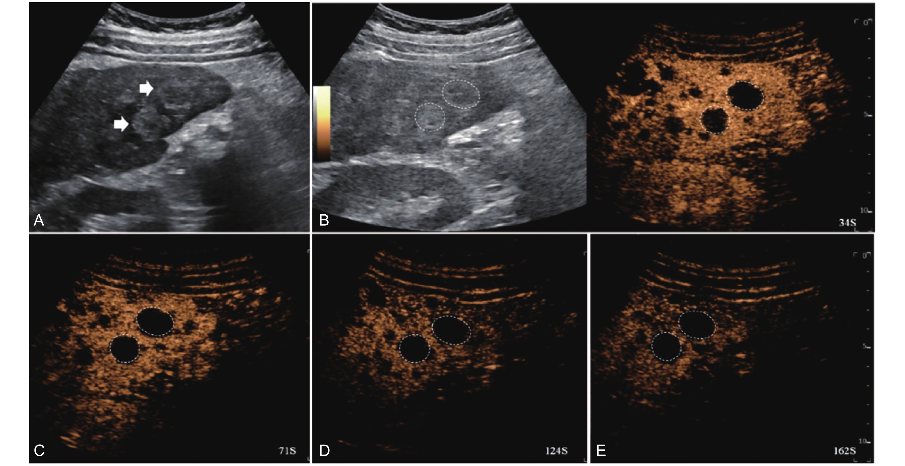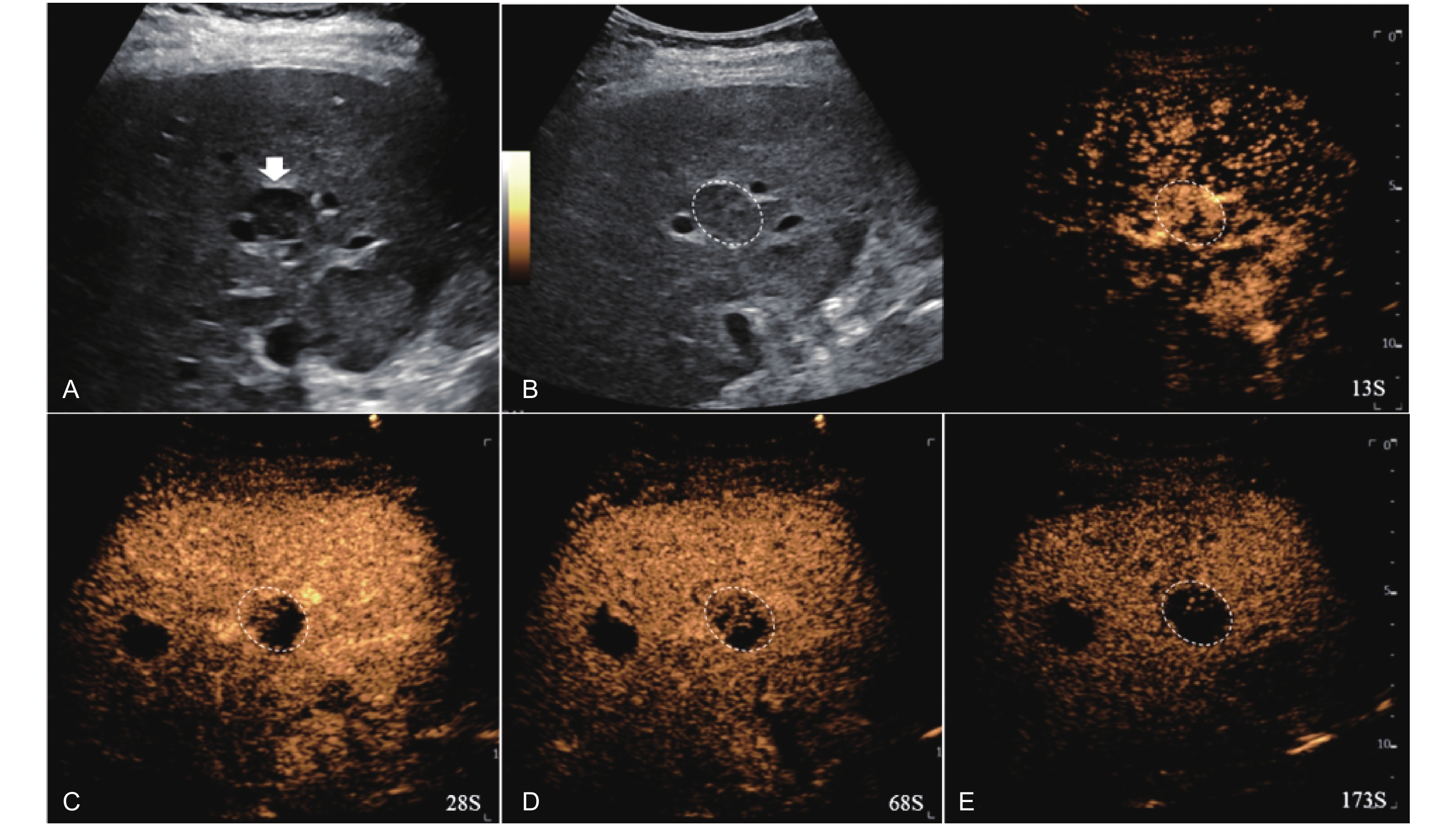 Artifact. Example of a treated tumor 101 days after TACE. (A) B-mode image shows two slightly hyperechoic lesions with scattered punctate calcifications (short arrow), measuring approximately 38 mm and 32 mm in segment VI and VII; (B-E) CEUS shows persistent intralesional flocculent hypoenhancement with punctate hyper- or isoenhancement (short arrow) throughout all phases, without evidence of contrast diffusion. This finding is considered an artifact."
