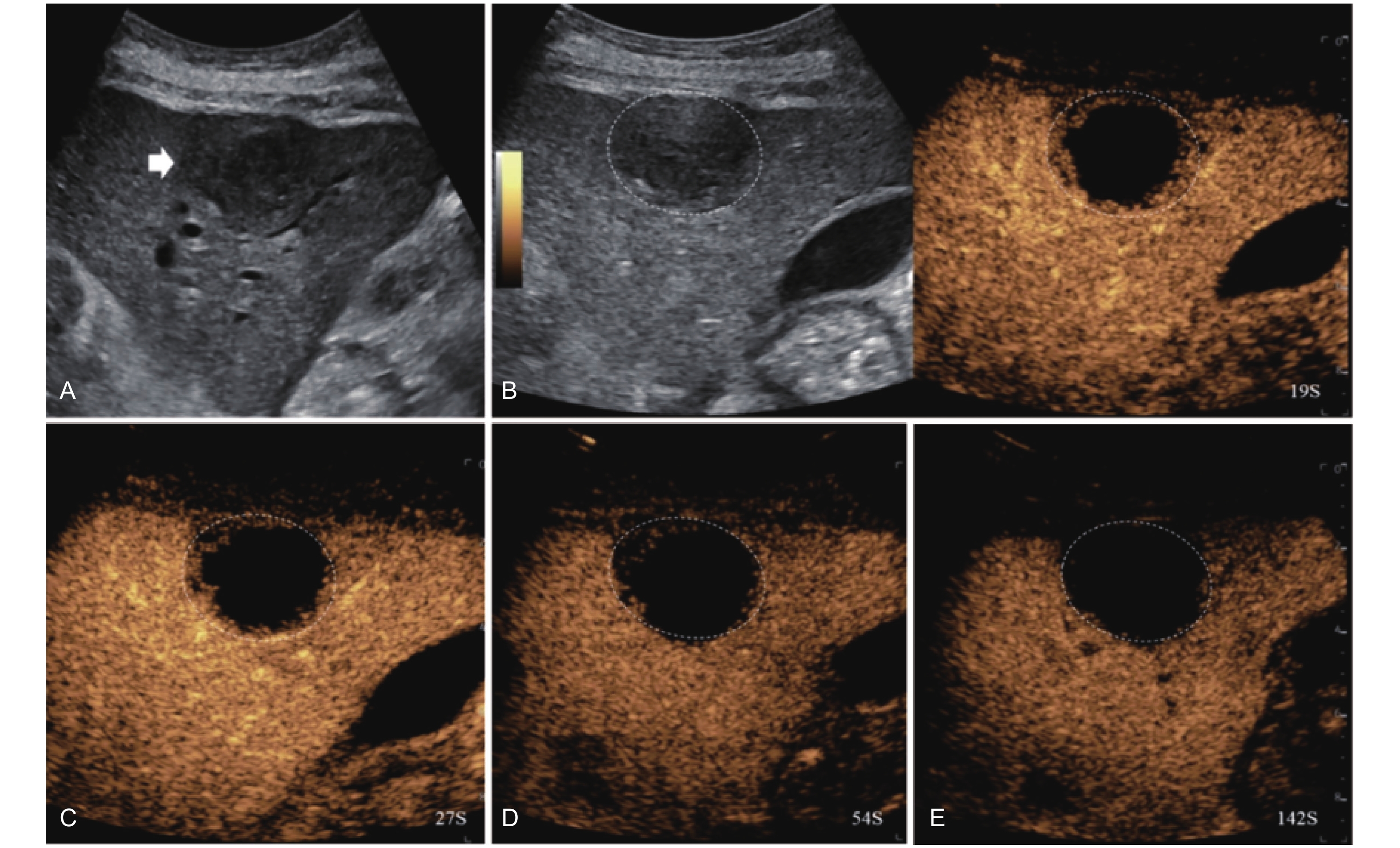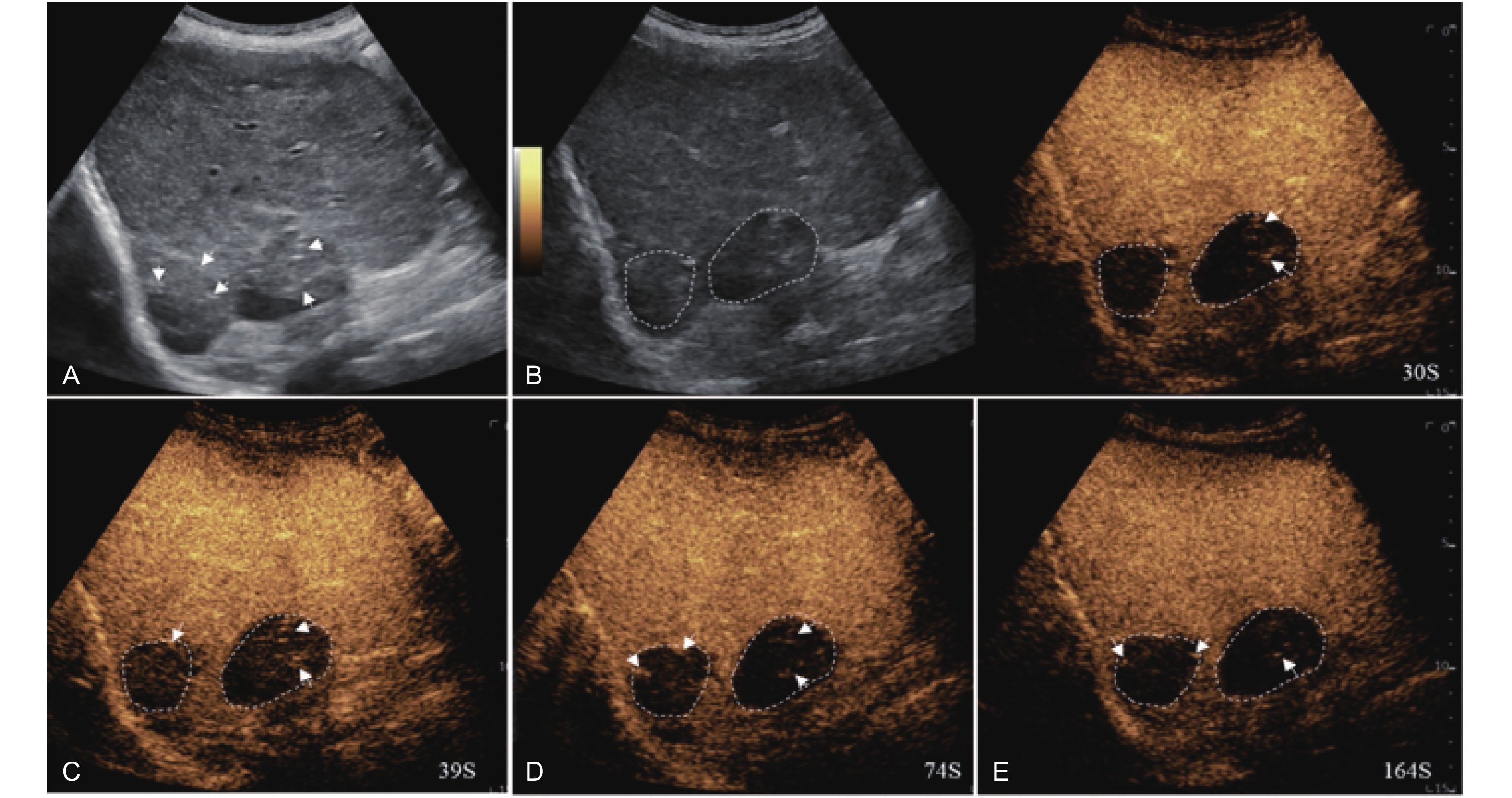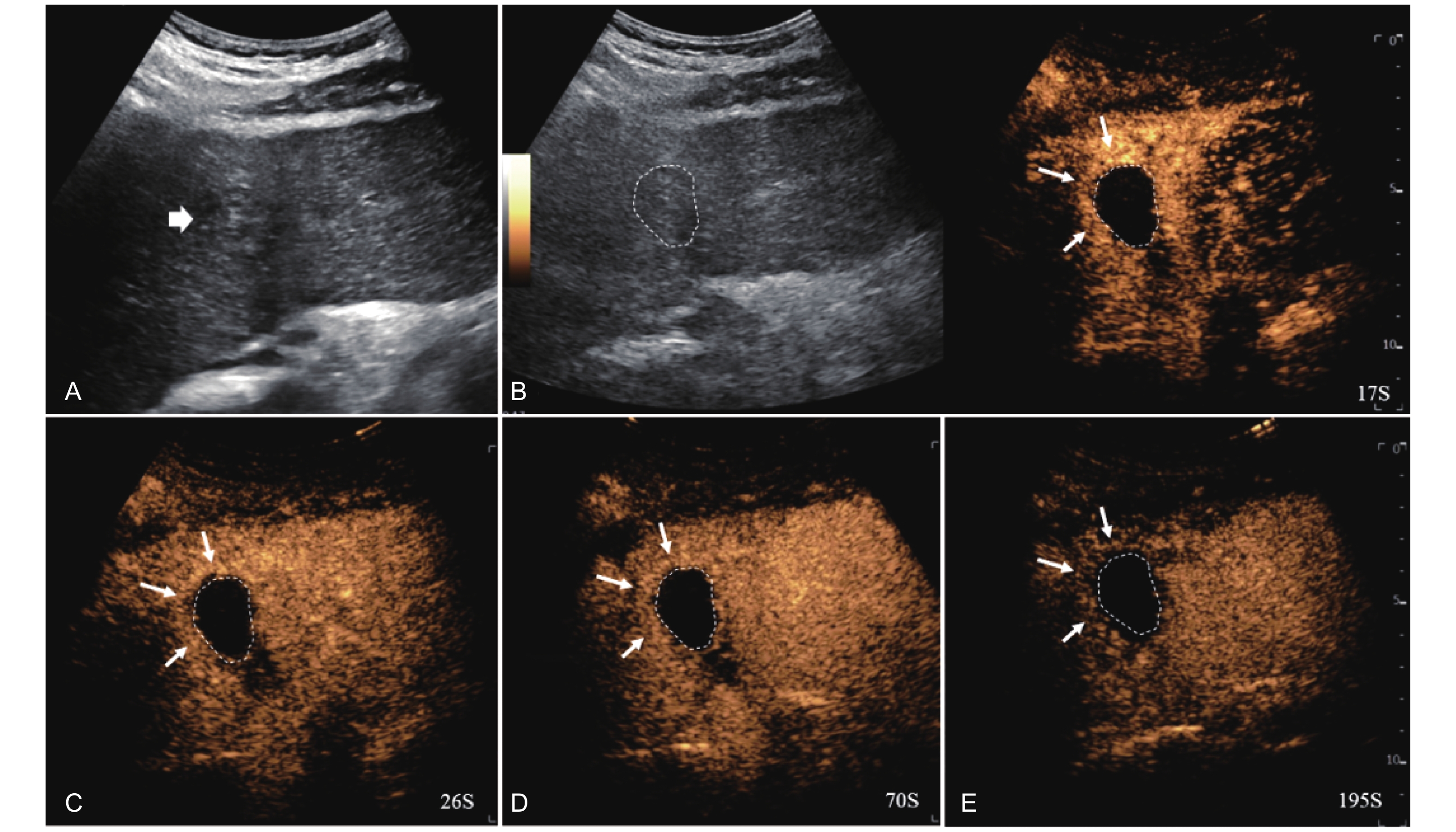 LR-TR Nonviable. Example of a nonviable tumor 14 days after TACE. (A) B-mode image shows two heterogeneous hyperechoic lesions (thick arrow) with irregular shape, measuring 17 mm and 18 mm in segment VI; (B-E) CEUS shows no intralesional enhancement with perilesional enhancement identical to the surrounding liver parenchyma in all phases. Findings are consistent with LR-TR Nonviable."