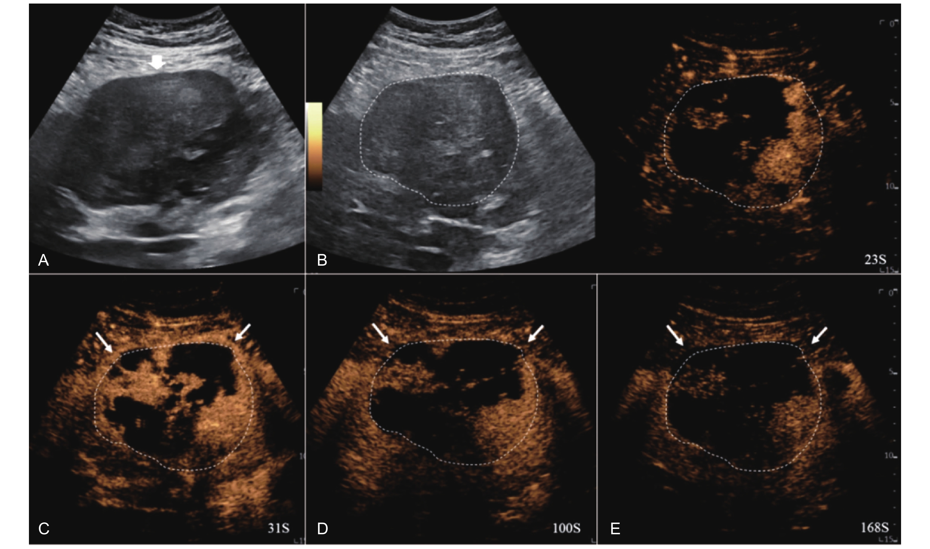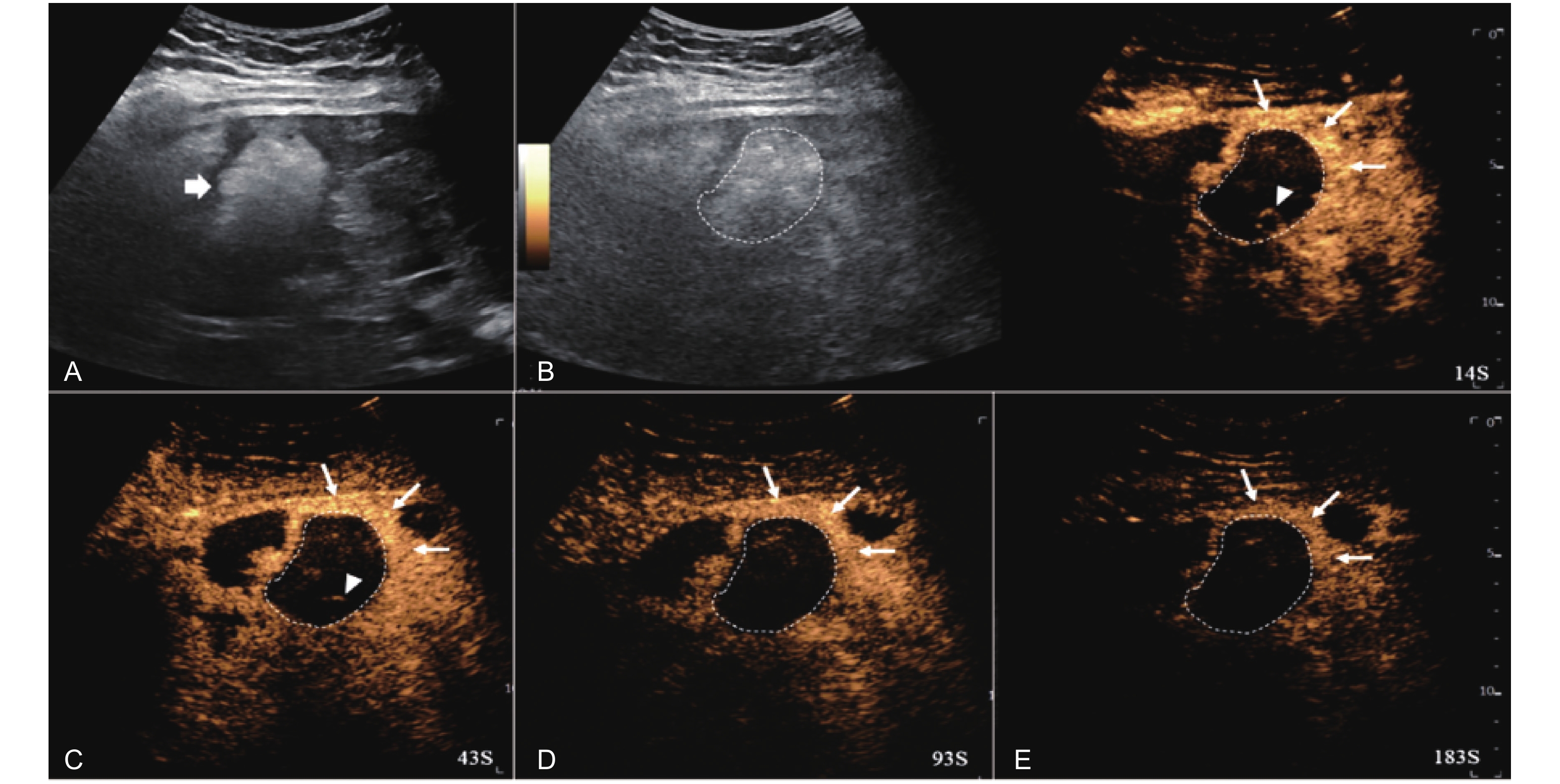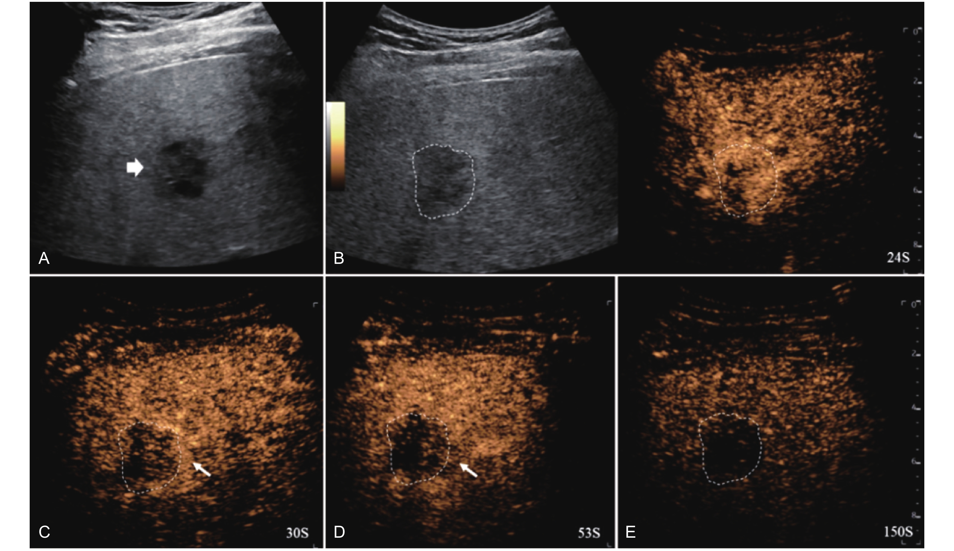 LR-TR Nonviable. Example of a nonviable tumor 14 days after TACE. (A) B-mode image shows two heterogeneous hyperechoic lesions (thick arrow) with irregular shape, measuring 17 mm and 18 mm in segment VI; (B-E) CEUS shows no intralesional enhancement with perilesional enhancement identical to the surrounding liver parenchyma in all phases. Findings are consistent with LR-TR Nonviable."