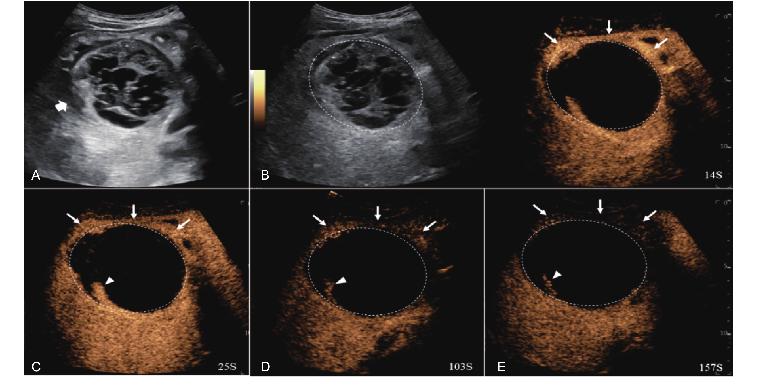 LR-TR Viable. Example of a treated tumor 16 days after TACE. (A) B-mode image shows a cystic-solid heterogeneous echogenic lesion with a peripheral hypoechoic band (thick arrow), measuring 71 mm in segment V and VI; (B-C) CEUS shows intralesional partial hyperenhancement (arrowhead) with perilesional hyperenhancement (thin arrow) during the arterial phase; (D-E) The lesion shows intralesional marked washout (arrowhead) and perilesional partial marked washout (thin arrow) in the portal venous and late phases. Findings are consistent with LR-TR Viable."