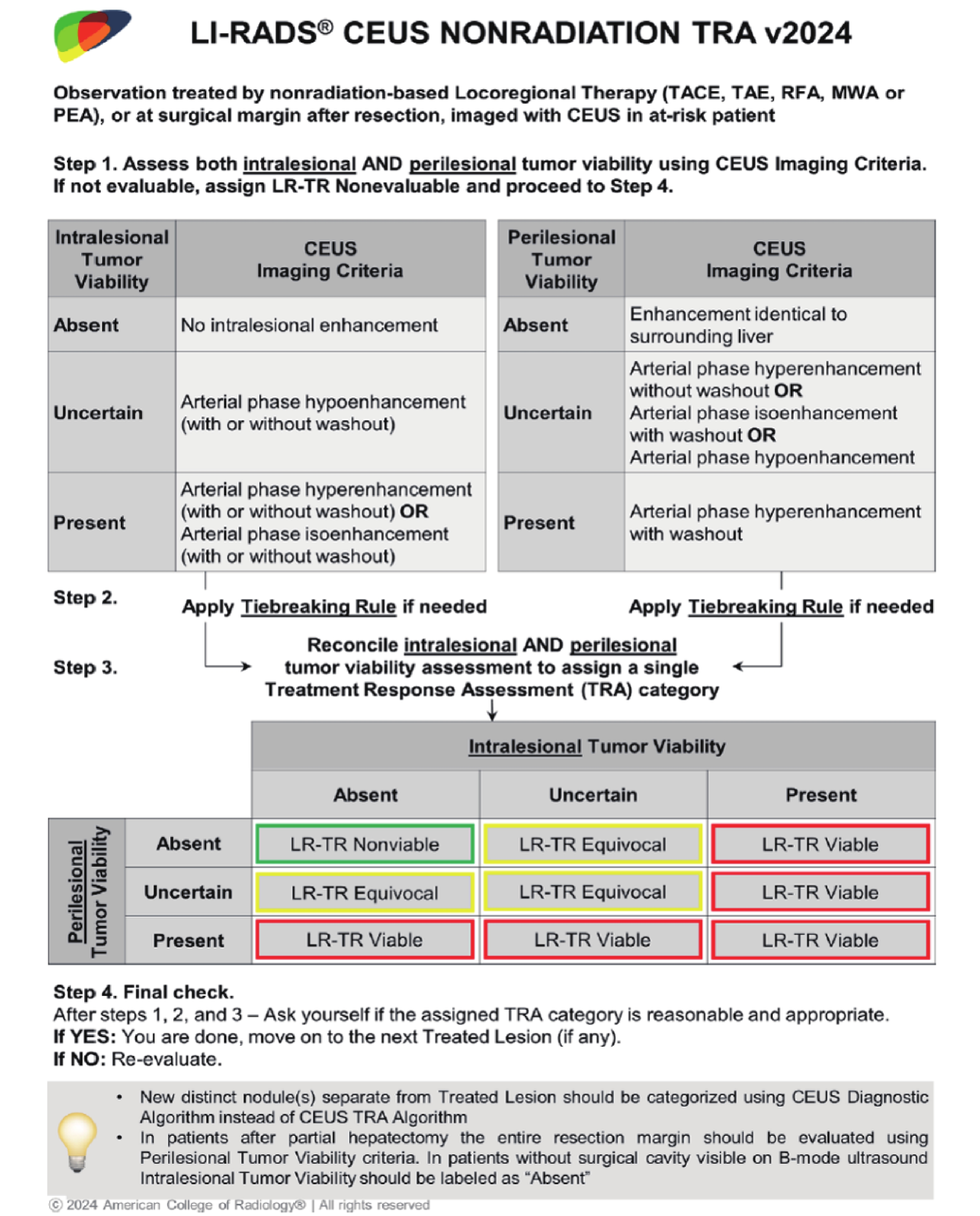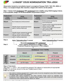 ACR CEUS LR-TR categories v2024 [27]. This flowchart illustrates the stepwise assessment of both intralesional and perilesional tumor viability using CEUS imaging criteria. Color-coded boxes indicate the final LR-TR categories, including green=Nonviable, yellow=Equivocal, and red=Viable. The algorithm incorporates a tiebreaking rule and reconciliation process to assign a single TRA category. Applicable for treated lesions after transarterial embolization (cTACE/DEB-TACE/TAE) and percutaneous ablation (RFA/MWA/PEI)."
