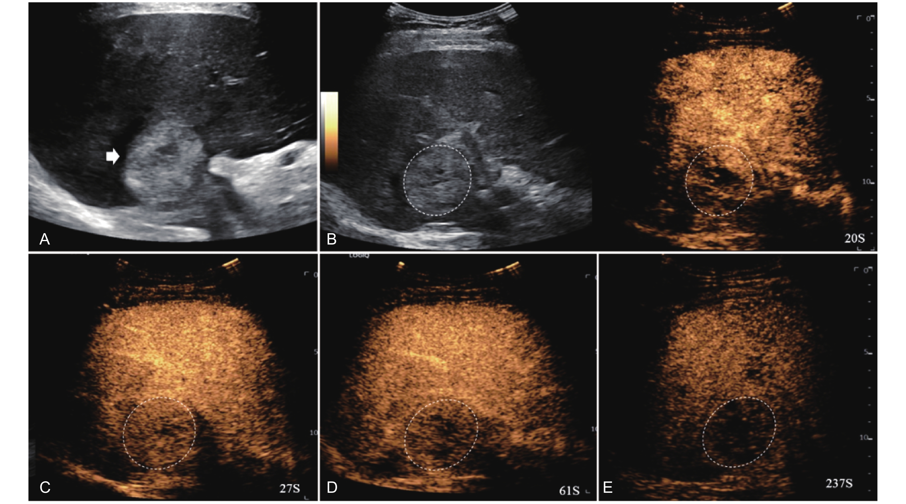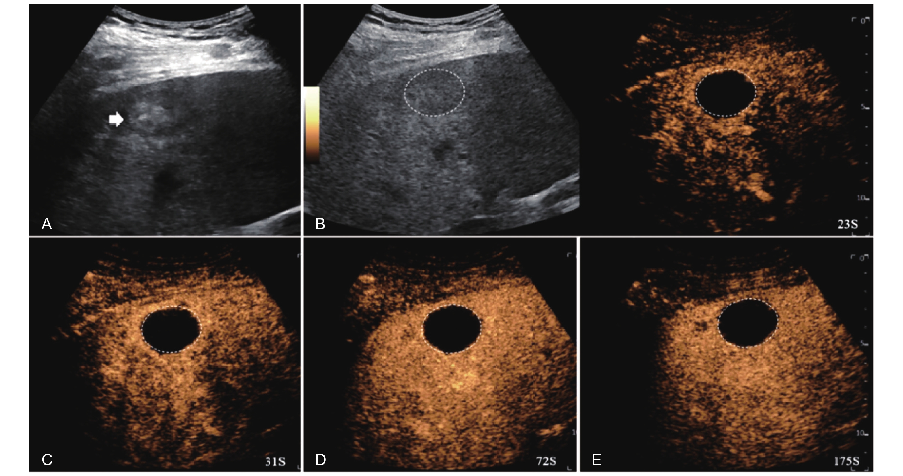 LR-TR Viable. Example of a treated tumor 15 days after TACE. (A) B-mode image shows slightly hyperechoic lesion with well-defined margins (thick arrow), measuring 22 mm in segment IV; (B-D) CEUS shows perilesional hyperenhancement (thin arrow) during the arterial and portal venous phases; (E) The lesion shows perilesional marked washout (thin arrow) in the late phase. No intralesional enhancement throughout all phases. Findings are consistent with LR-TR Viable."